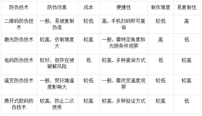 為了更直觀地了解各種防偽技術(shù)的特點(diǎn),我們可以從多個(gè)維度進(jìn)行對(duì)比分析,以下是一個(gè)簡(jiǎn)單的對(duì)比表格: