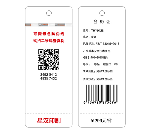 雙線安全線防偽是當前最新防偽技術(shù)之一,其安全級別等同與人民幣防偽安全線級別。最大的特點就是安全級別高,防偽效果好,還有就是易于鑒別。其實這一點很重要,因為防偽主要是做給消費者看的,是企業(yè)提供給消費者區(qū)分真假的認知工具,目的是讓消費者不受假冒偽劣產(chǎn)品的蒙蔽。要提高消費者鑒別積極性,提高鑒別率,使主動識別、拒絕、打擊假冒成為可能,那防偽特征就必須能夠讓任何層次的消費者、管理者無需借助任何儀器、工具或支付額外費用都能親自簡單、準確地識別、而且結(jié)論準確可靠。因此,安全線防偽技術(shù)是當前最好的防偽措施之一。北京星漢特種印刷有限公司將這項技術(shù)運用到了收拾吊牌、衣服吊牌中,也受到了客戶的青睞。
